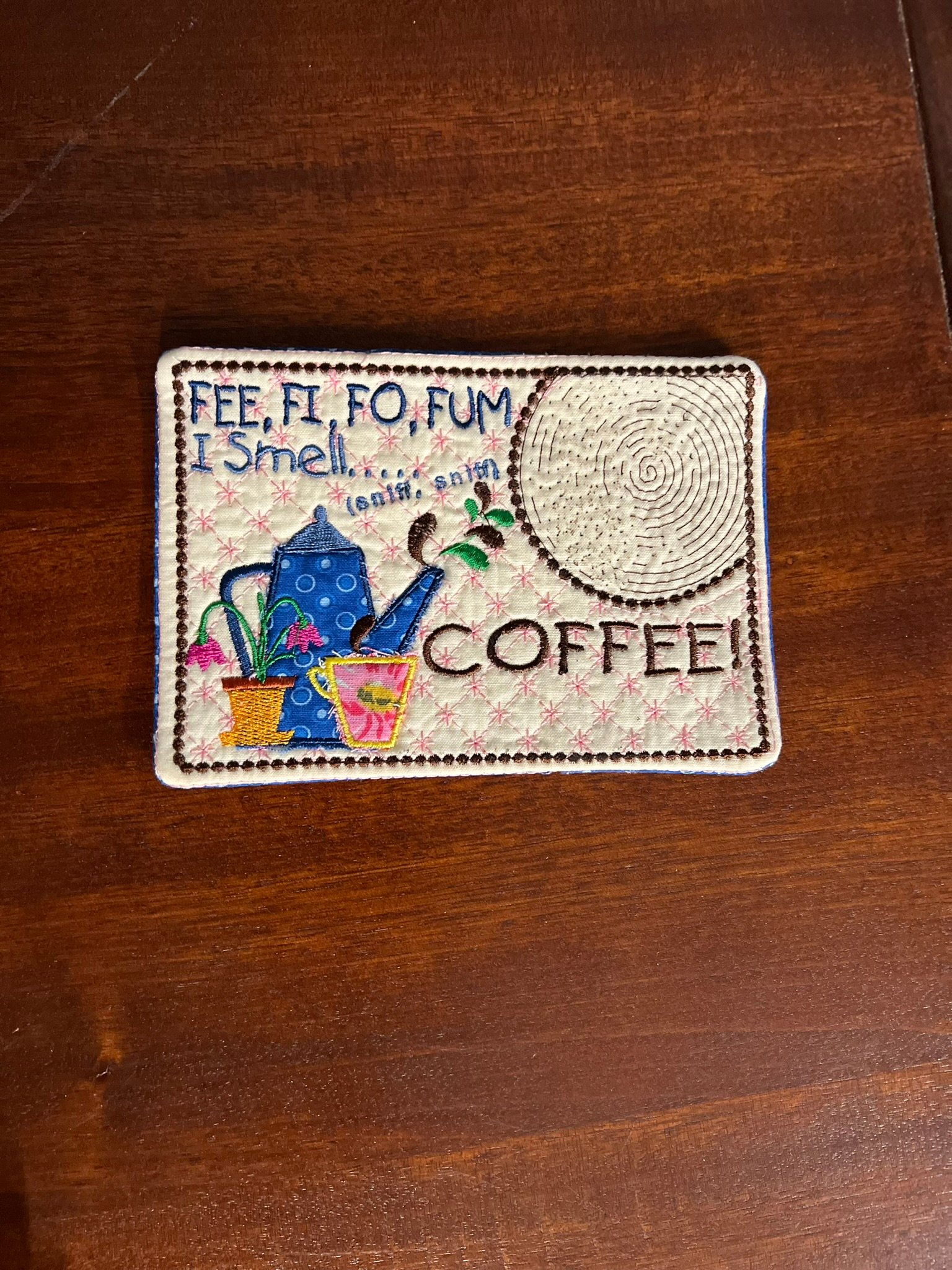 Mug rug with a coffee pot and tea cups that includes the phrase "Fee, Fi, Fo, Fum I smell coffee" 6.5 inches x 4.5 inches